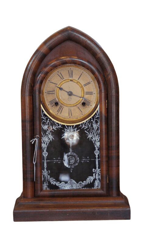 An Antique Victorian Ansonia Gilt Metal, Black Lacquer Chiming Working Clock with Key