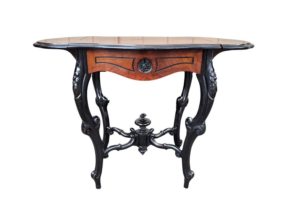 An Antique Victorian Burr Walnut and Ebonised Drop Side Table and Fitted Interior