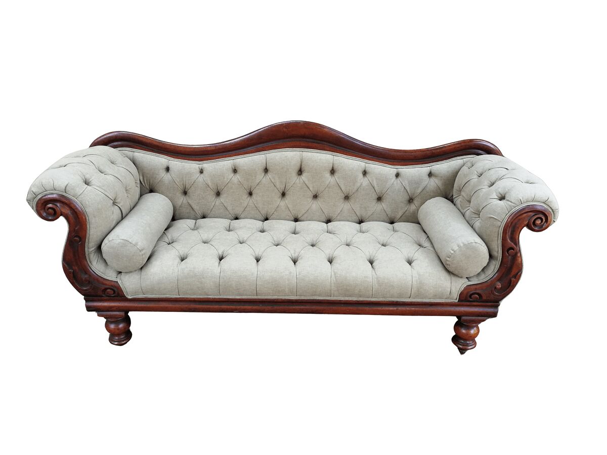 An Antique Victorian Carved Rosewood Settee on Castors Unholstered in French Linen with Bolsters in a Deep Button Finish