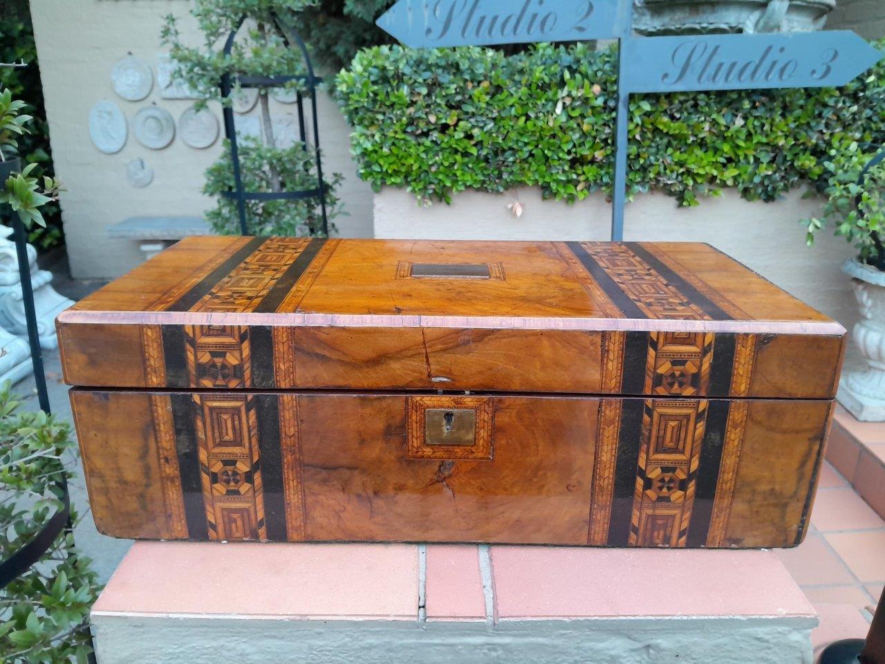 An Antique Victorian Circa 1800’s Walnut And Inlaid Writing Box With Leather Interior