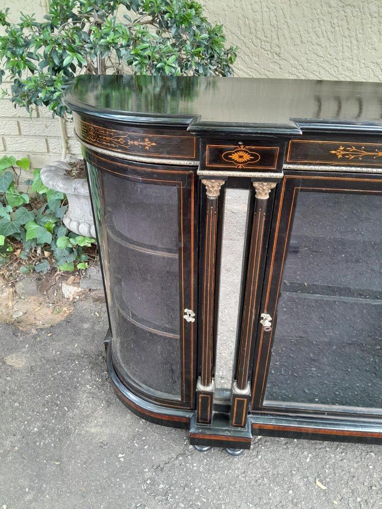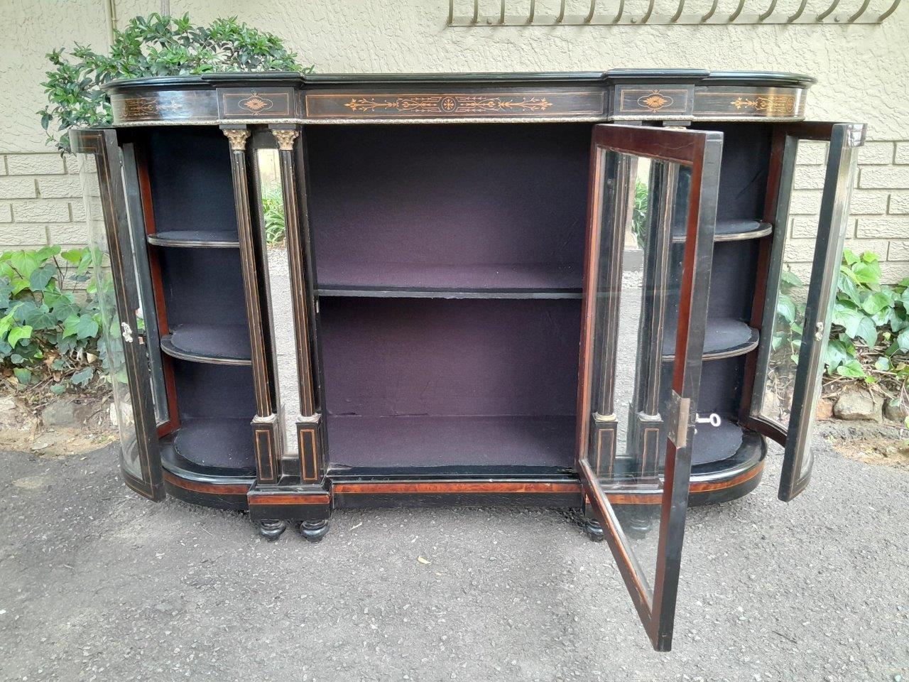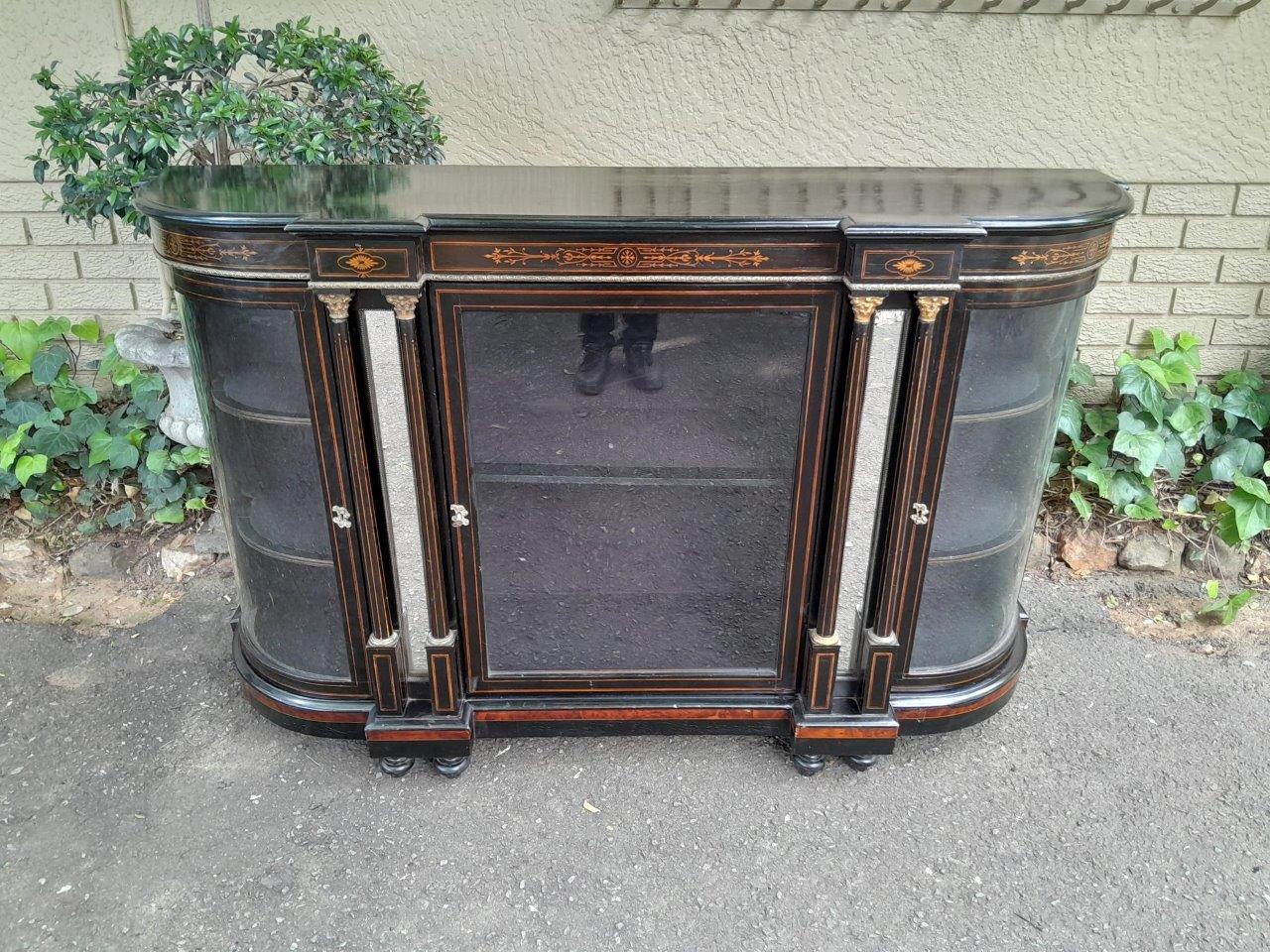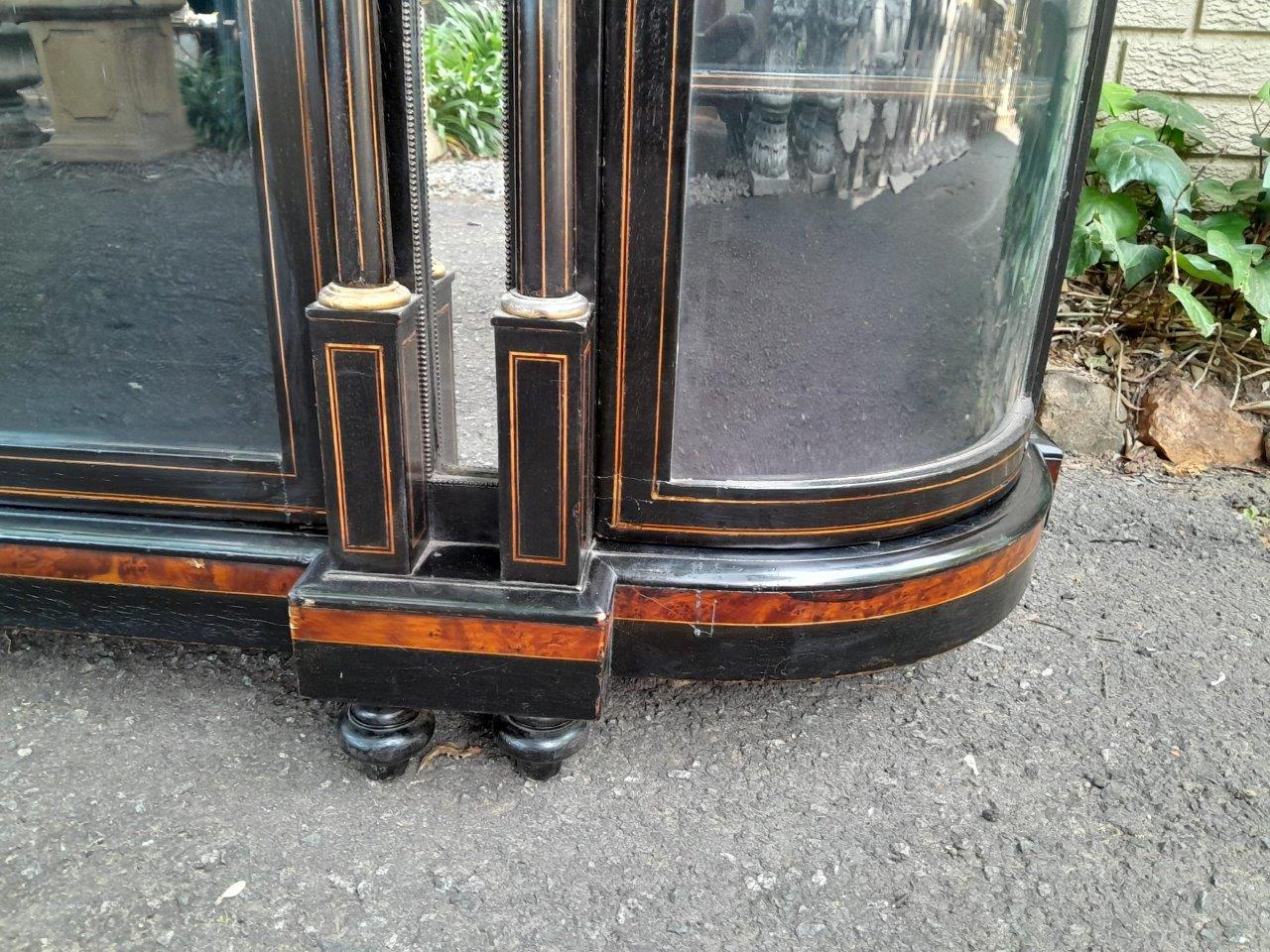 An Antique Victorian Ebonised And Inlaid Chiffonier With Curved Glazed Doors