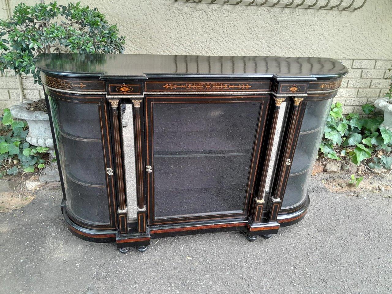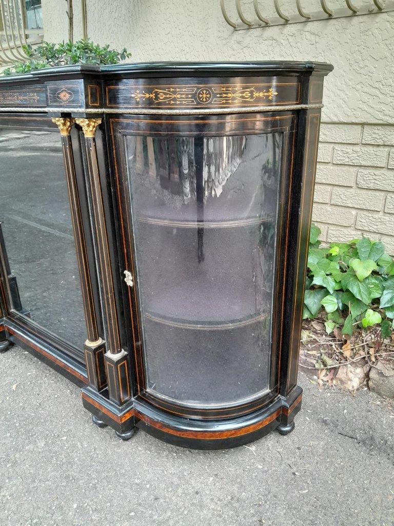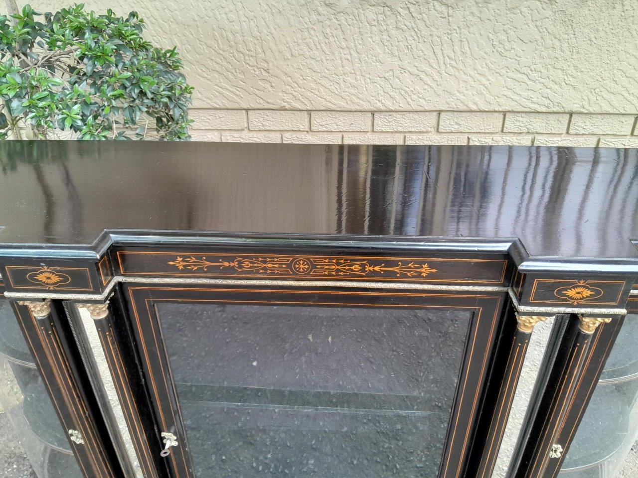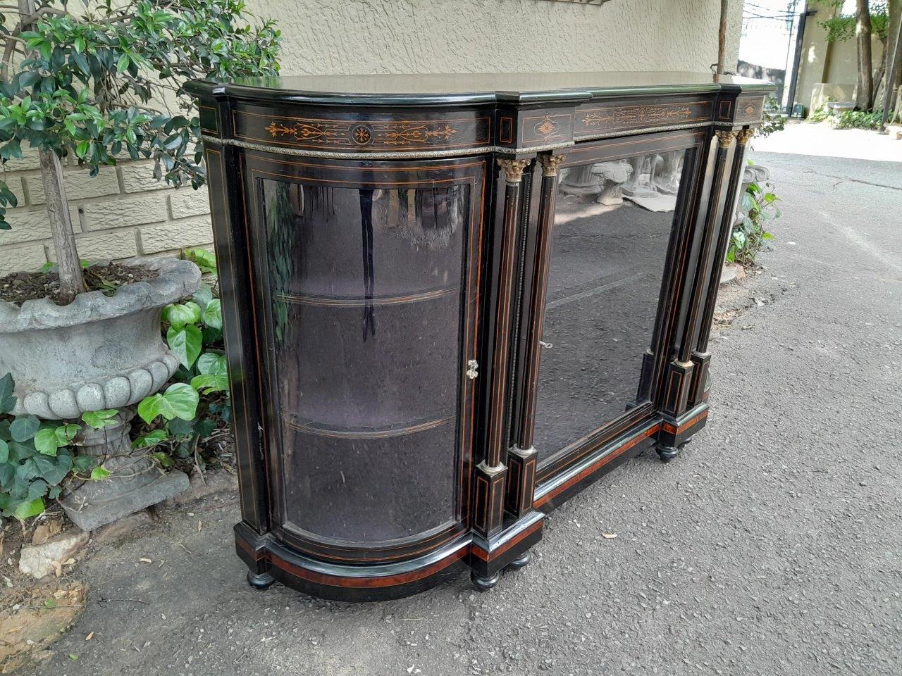 An Antique Victorian Ebonised And Inlaid Chiffonier With Curved Glazed Doors