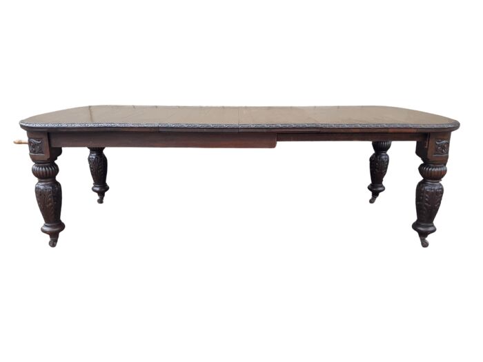 An Antique Victorian English Carved Oak Extending Dining Table on Castors and with Crank Handle (8-10 Seater)