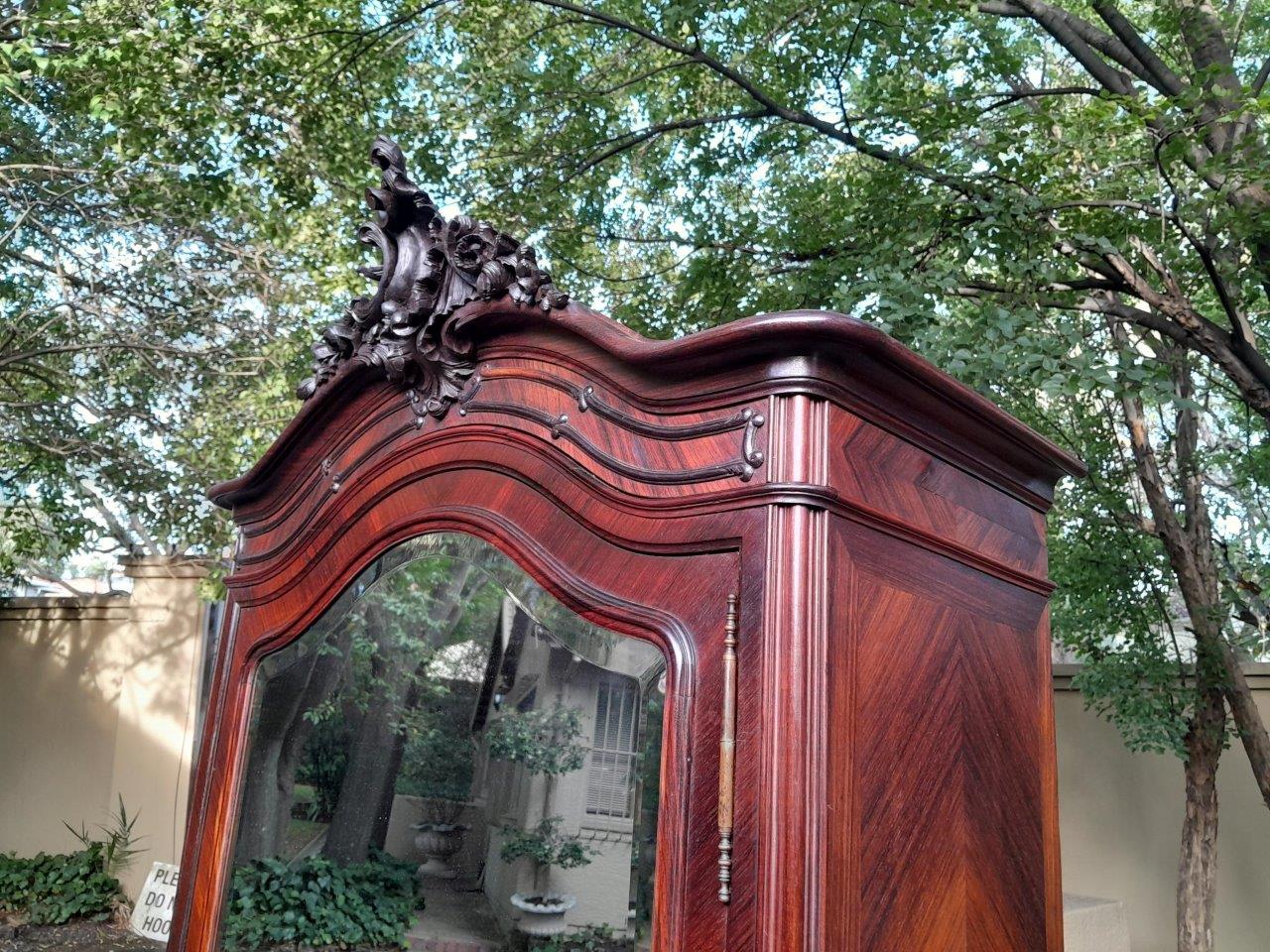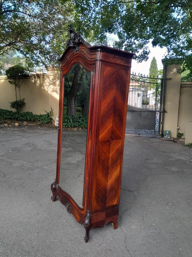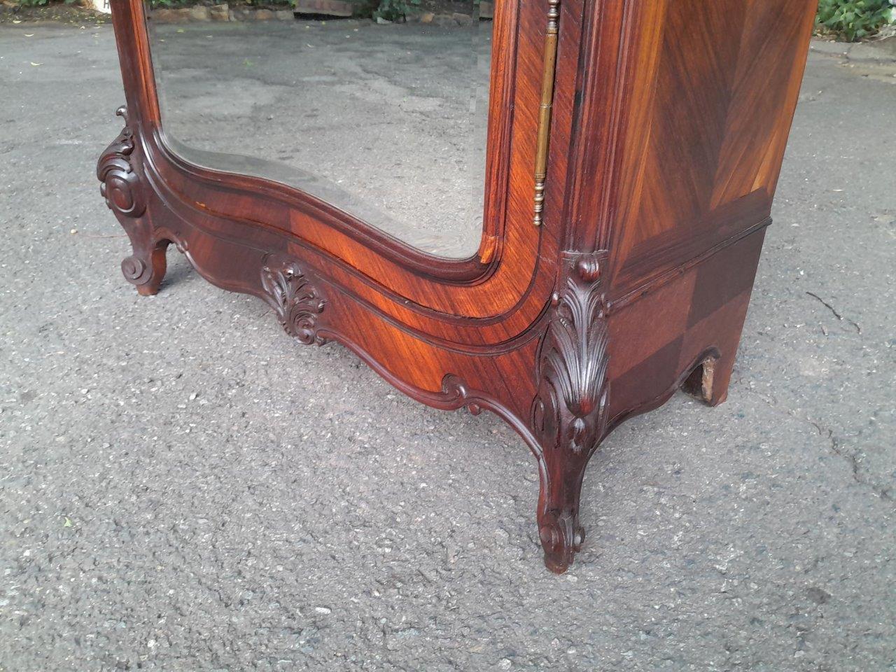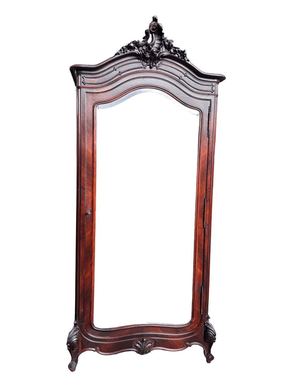 An Early 20th Century French Carved Rosewood Armoire with Bevelled Mirror and Lock and Key