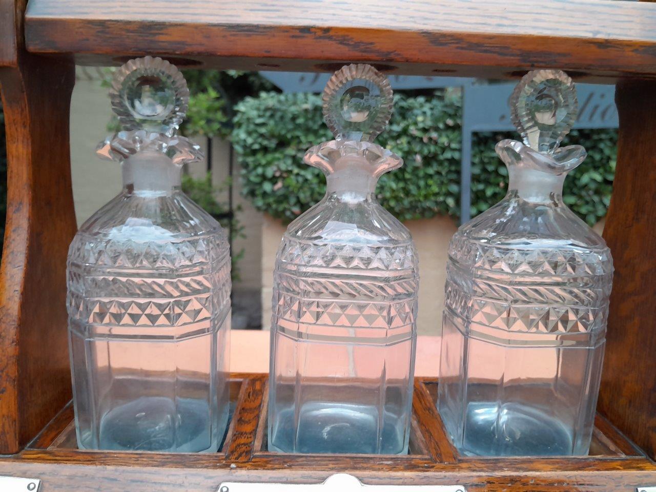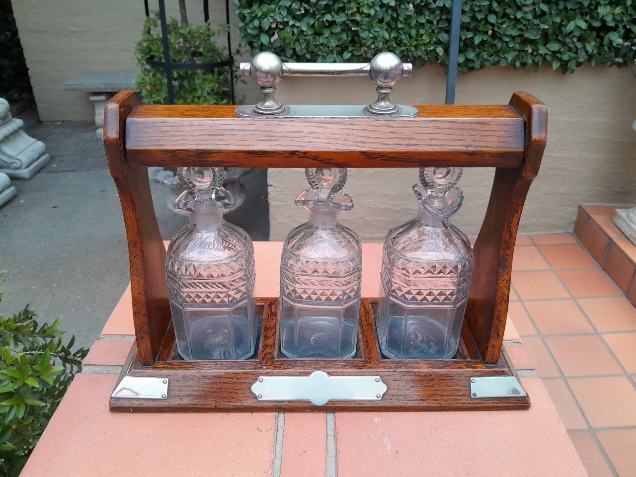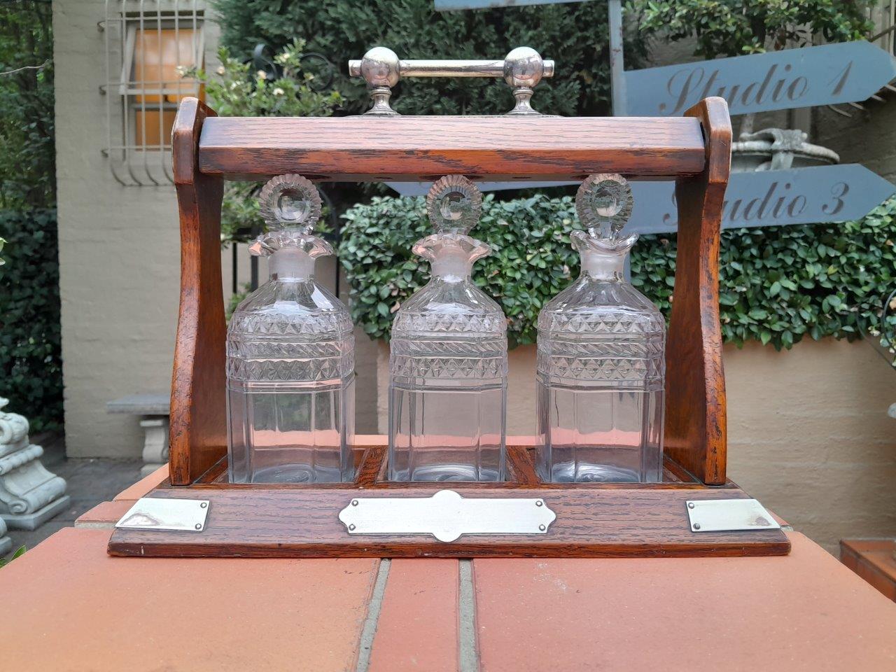 An English Oak Tantalus with 3 Glass Decanters & Metal Hardware