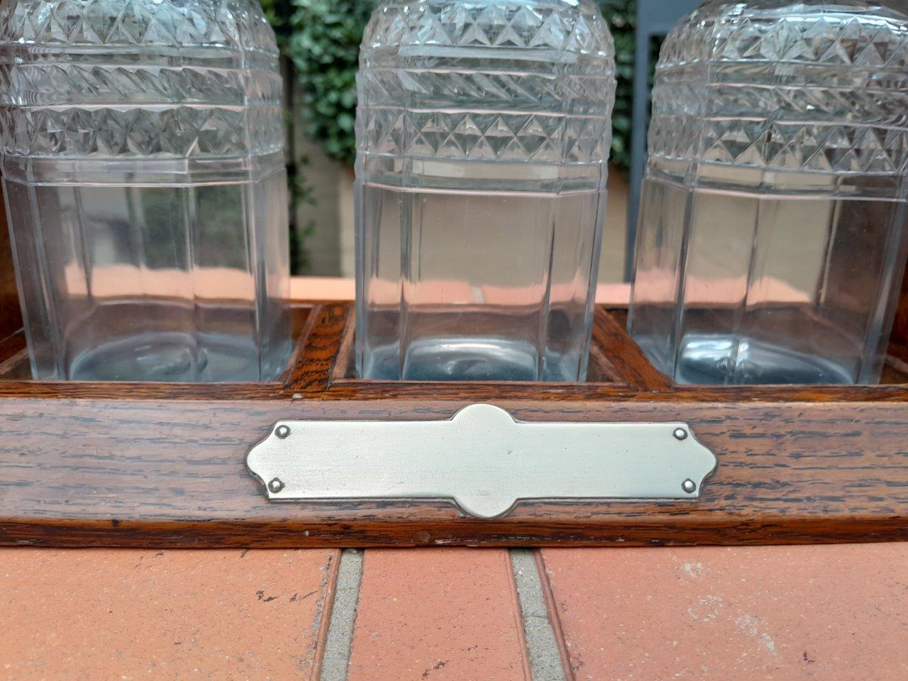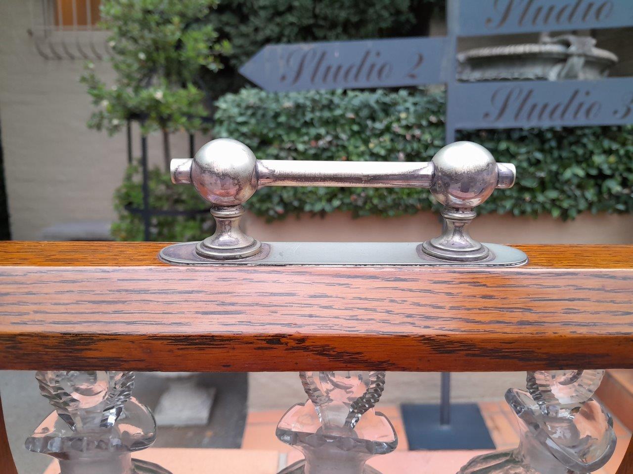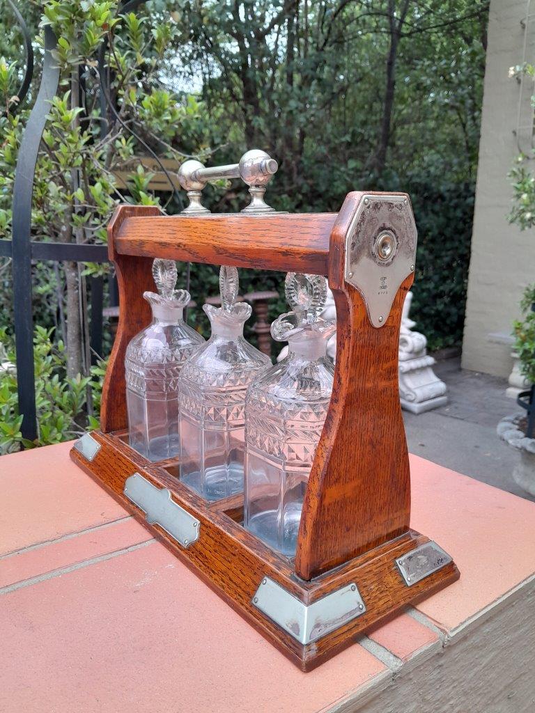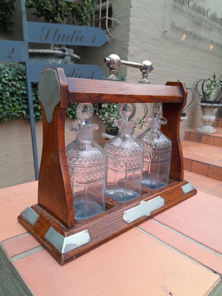 An English Oak Tantalus with 3 Glass Decanters & Metal Hardware