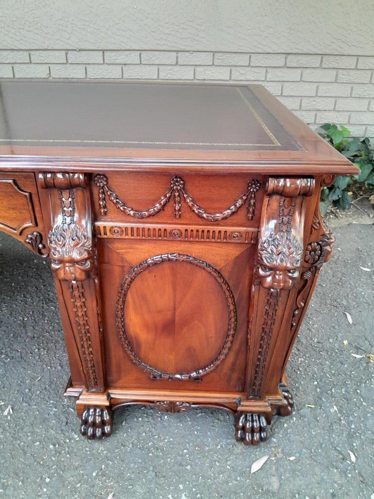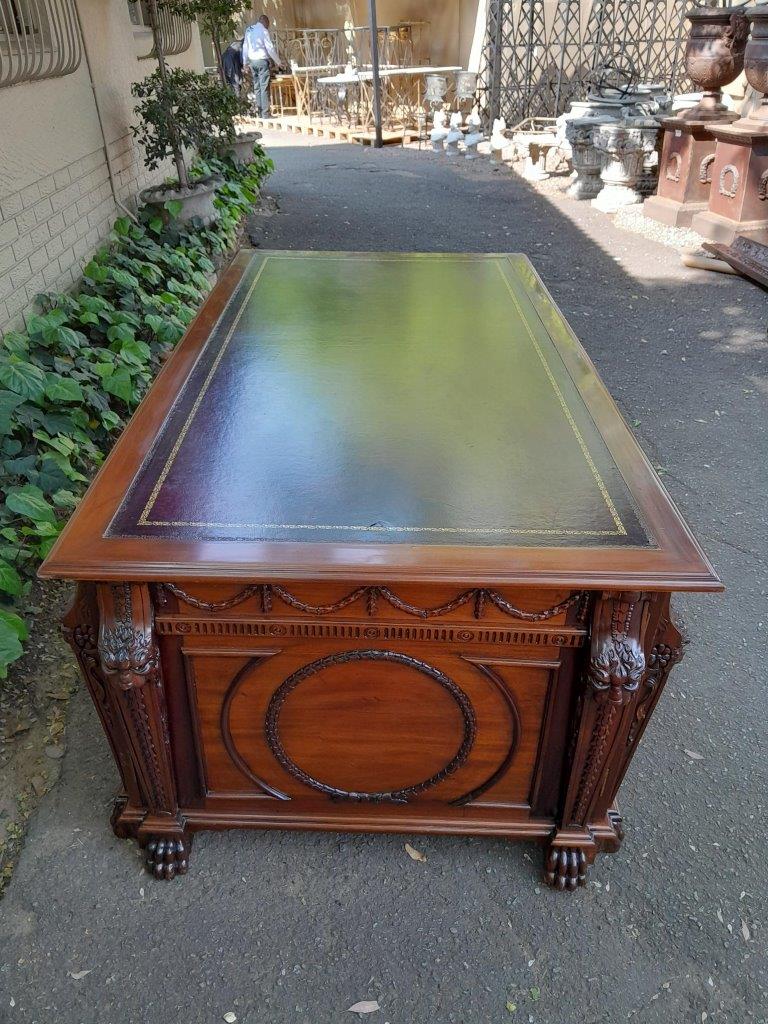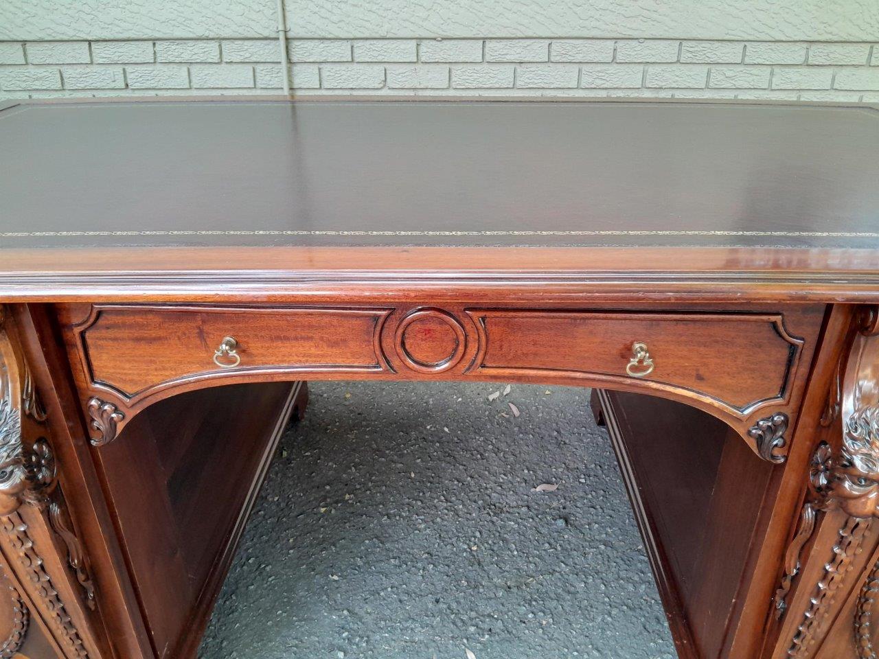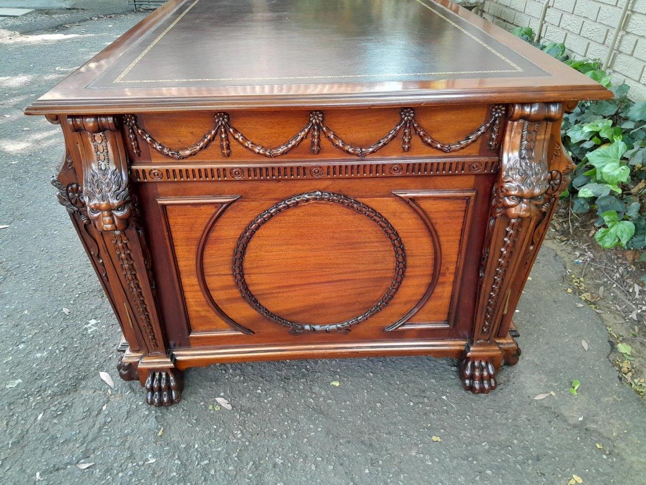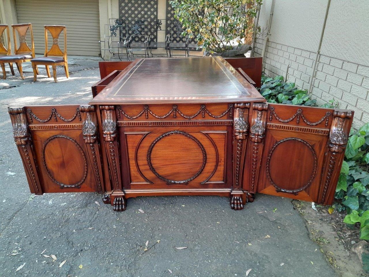 An Exceptional William Iv Style Carved Teak Wood Partners Desk With Tooled Leather Top. Drawers And Doors On Both Sides