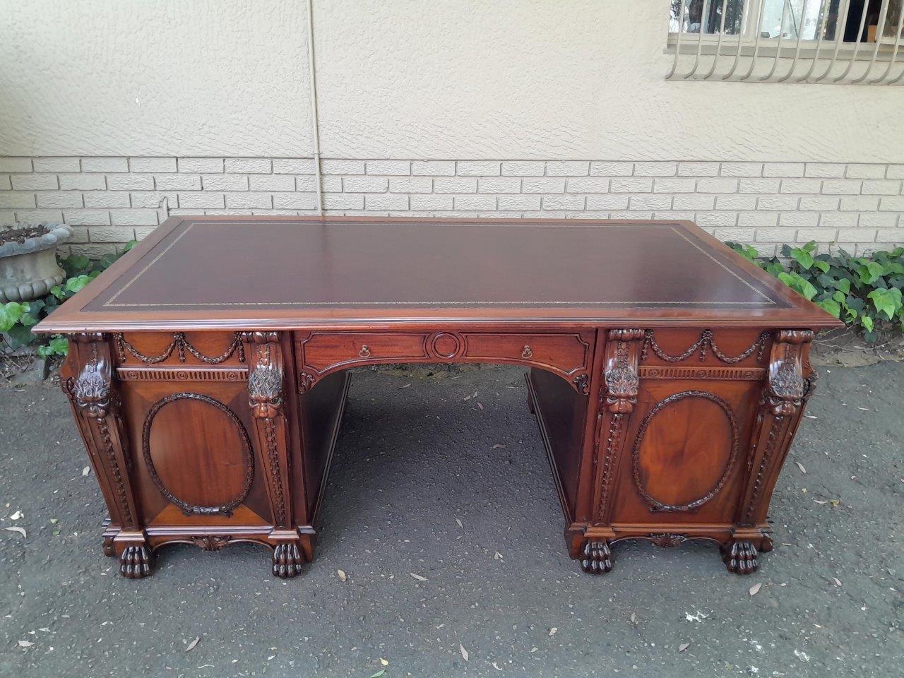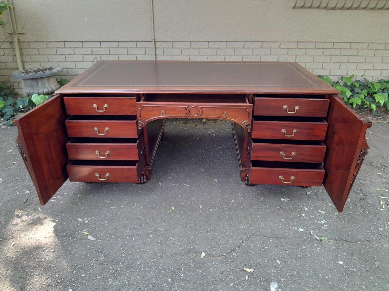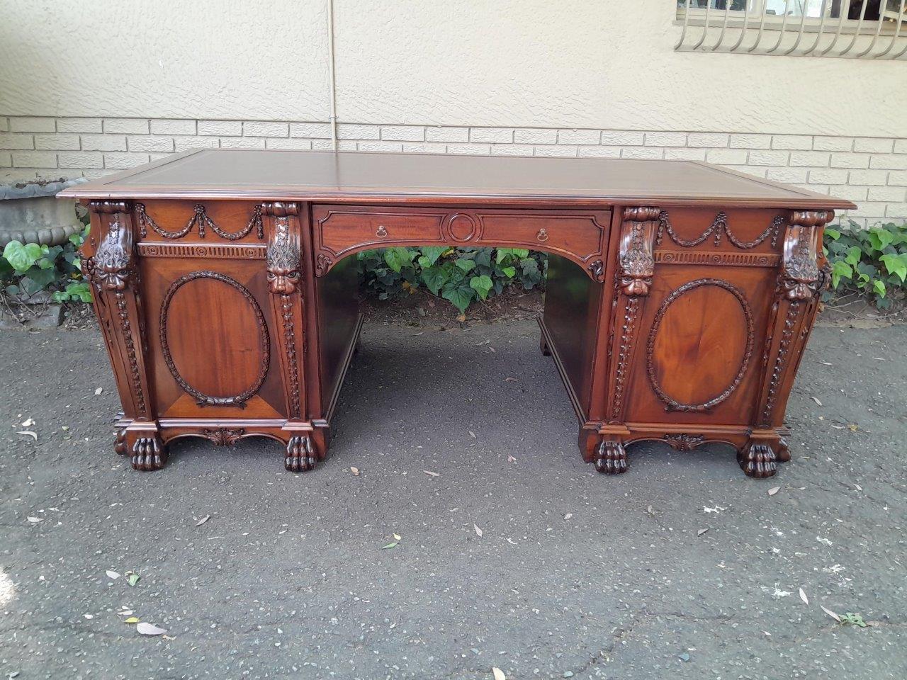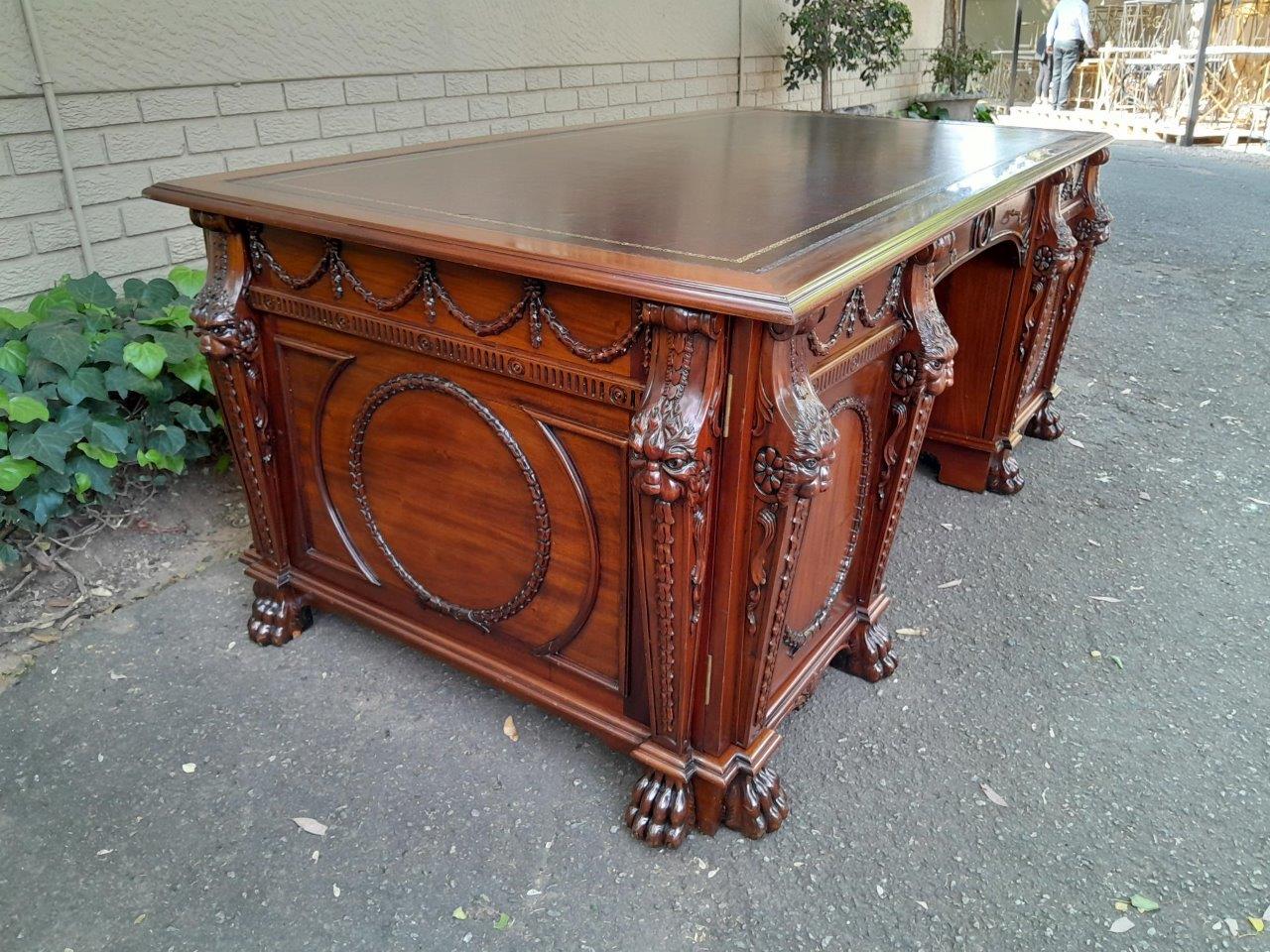 An Exceptional William Iv Style Carved Teak Wood Partners Desk With Tooled Leather Top. Drawers And Doors On Both Sides