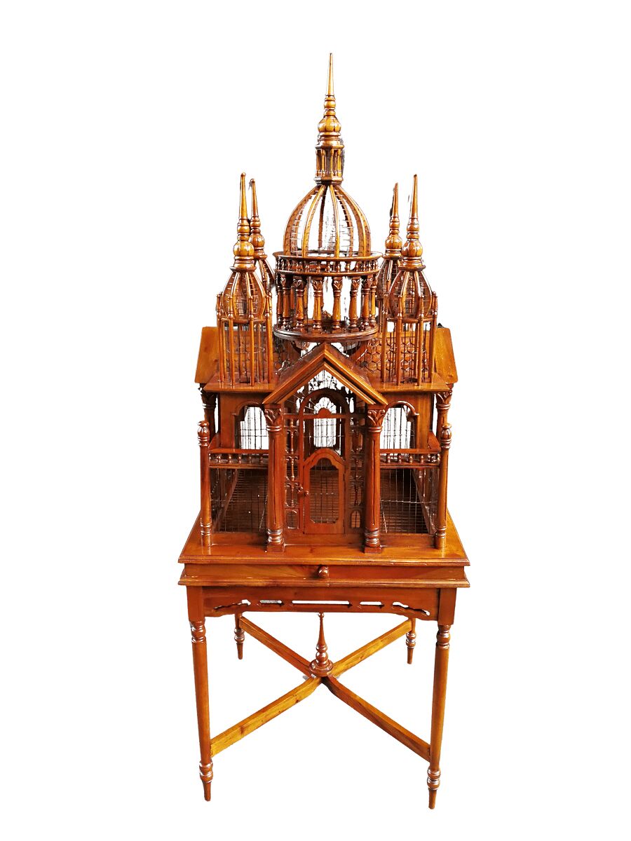 An Italian (Tuscany) 20th Century Carved Mahogany and Walnut Victorian Cathedral Style Bird Cage on Stand Crafted ND