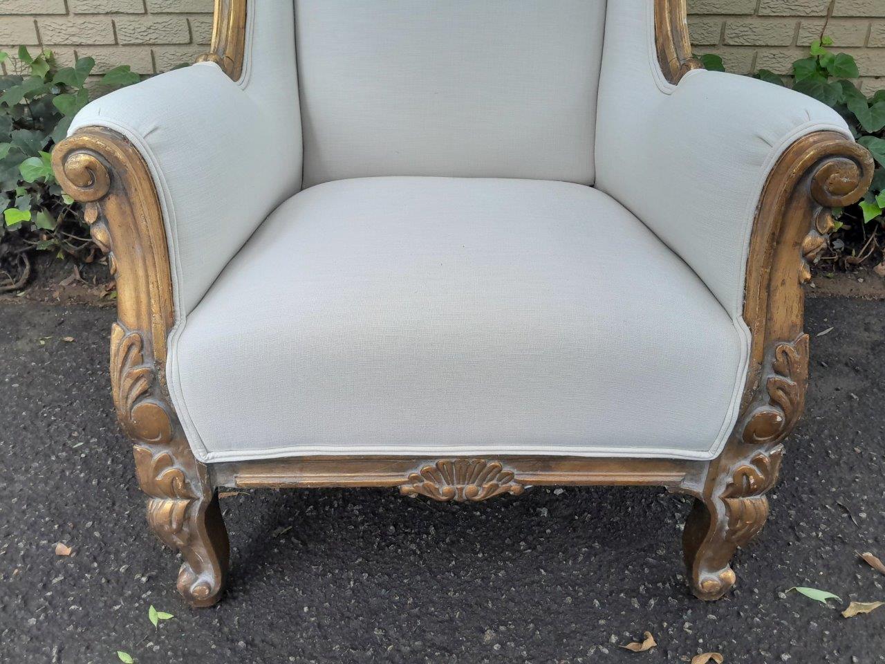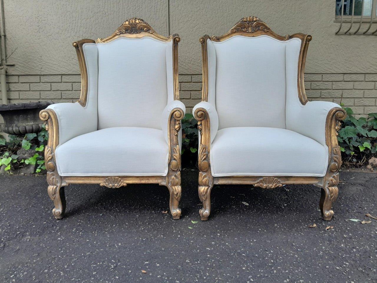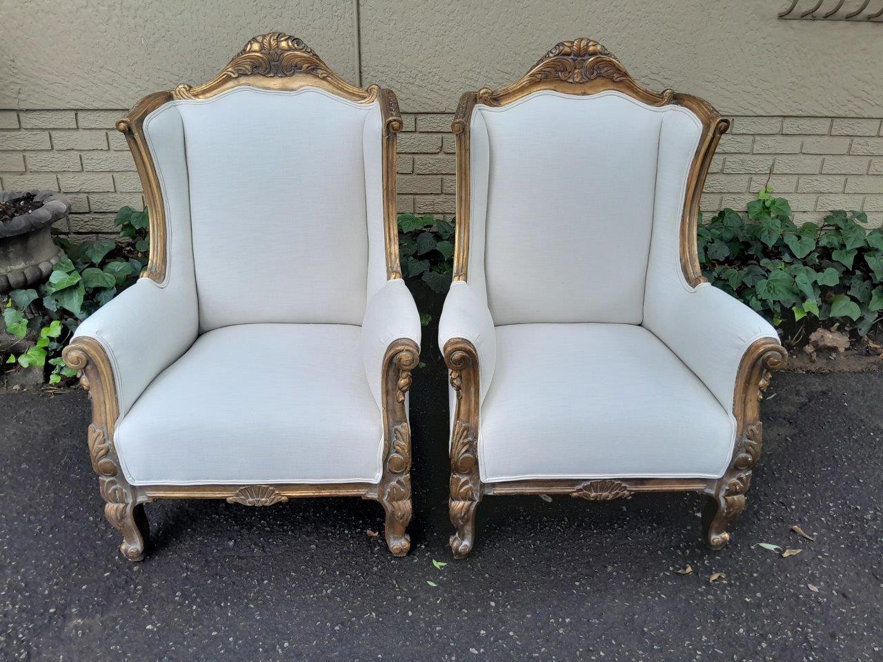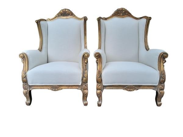 An Ornately Carved Pair Of Giltwood Chairs Upholstered In Leather