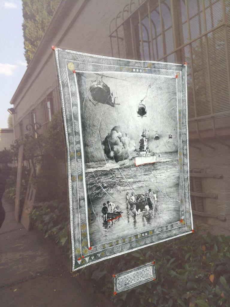 Boys with British Battleship a Johan du Plessis (South Africa, 20th C.), ink, pencil, varnish and wax on paper, signed, dated 1990
