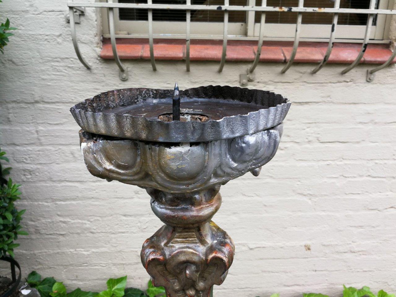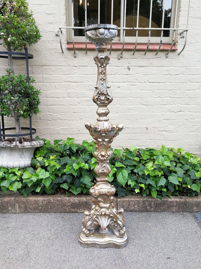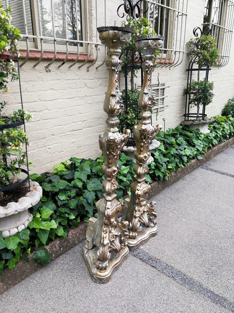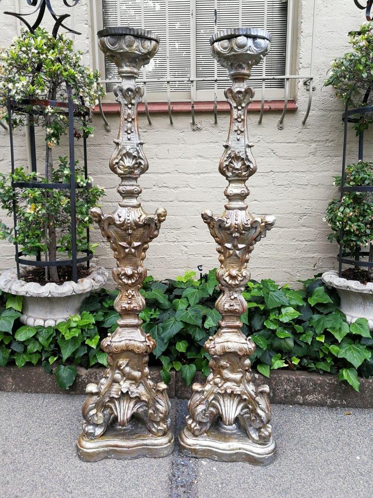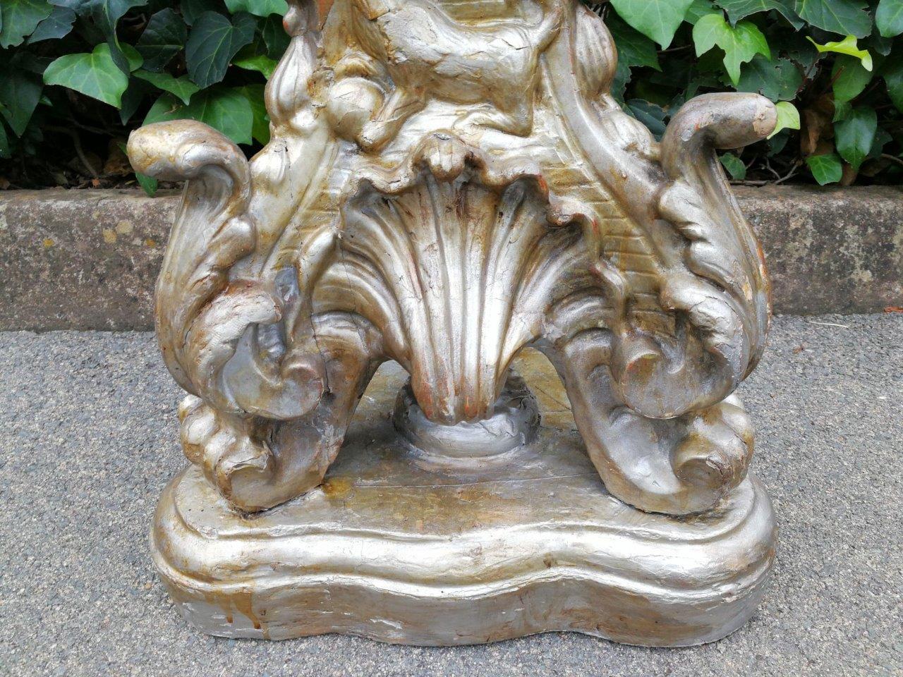 Pair Of Baroque-Style Silvered Wooden Carved Altar Pricket Sticks, 19th Century, Carved With A Pair Of Cherubs