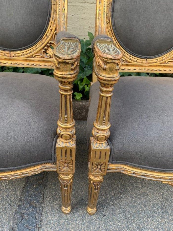 A 20th Century Pair (over 80 years old) of French Style Ornately Carved and Gilded Arm Chairs Upholstered in a French Linen ND